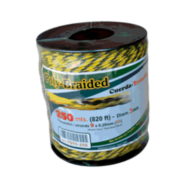 Cordón conductor PolyBraid de alta visibilidad para cercados eléctricos. Con un diámetro de 3.0mm y 9 filamentos de acero inoxidable, ofrece una excelente conductividad y una vida útil estimada de 5 a 7 años gracias a su protección UV. Ideal para perímetros de seguridad y control de ganado.