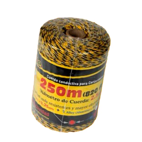 Asegure la máxima eficiencia en sus cercos eléctricos con el PolyWire de 250 metros. Diseñado por Elektrochoke, este hilo cuenta con tecnología de doble masa de conductividad, superando el rendimiento de los hilos tradicionales de 6 filamentos. Su diámetro de 2.5 mm y filamentos reforzados ofrecen una durabilidad superior para el manejo de ganado.